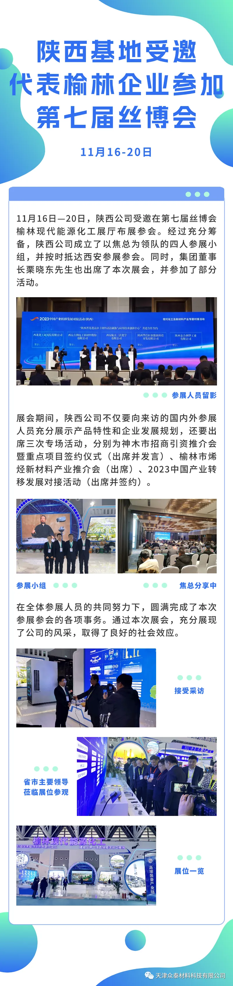 陜西公司受邀在第七屆絲博會,榆林現(xiàn)代能源化工展廳布展參會。經(jīng)過充分籌備,陜西公司成立了以焦總為領(lǐng)隊的四人參展小組,并按時抵西安參加展會。同時,集團(tuán)董事長栗曉東先生也出席了本次展會,并參加了部分活動。